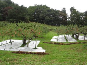 木々の葉が色づく中、池の野鳥を眺めながら進み、リンゴ畑の脇を抜けると小鹿(おか)公園へと続く森へ。