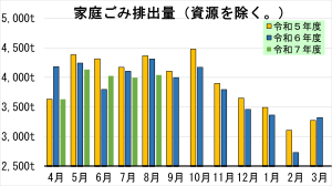 令和7年8月の家庭ごみ(資源を除く。)の排出量は4,041トン。去年の8月は4,312トンだったから、今年のほうが271トン減っているよ。