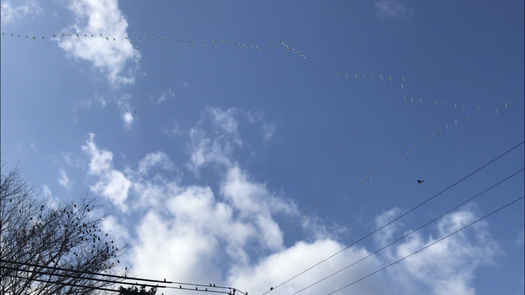 その上空にはハクチョウの北へ帰る群れが・・・旅立ちの季節(涙)
