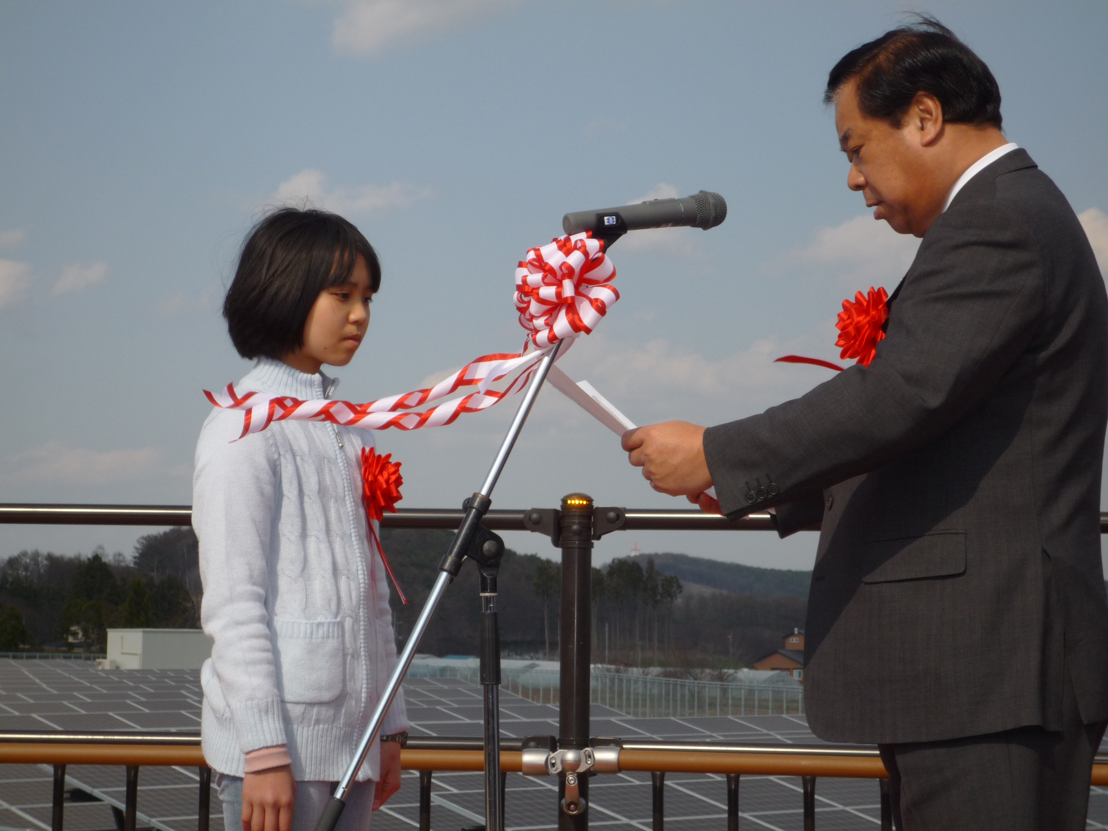 当日は晴天に恵まれ,関係者によるテープカットが行われたほか,「ソーラーガーデン姫神」の応募者である小川純佳さん(杜陵小学校6年生)に表彰状と記念品の贈呈も行われました。